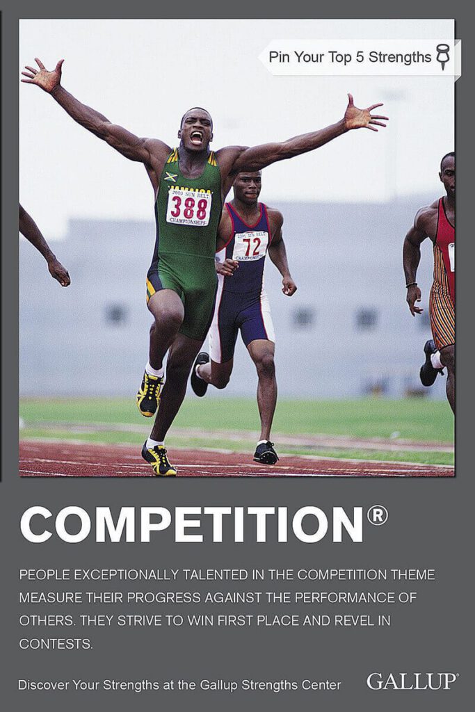 승부(Competition) 테마는 이기는 법을 아는 강점이다. 상대가 정해지고 경기장이 정해지면 어떻게 해야 이기는지 본능적으로 파악하는 사람이다. 따라서, 기준이 되는 성과 또는 사람을 세우는 것이 중요하다. 승리를 정의하라. 무엇이 이기는 것인지 정확한 기준과 대상을 정해야 승리를 만끽하게 될 것이다. 만약, 승리의 순간을 맞이하였다며 어떻게 승리했는지, 나의 성공 요인이 무엇인지 생각해 보고 정리해 보자. 본능적인 승리공식을 더 자세히 알고 더 다듬는다면 더 높은 성과에 도전하게 될 것이다. 또한 승부 테마는 자신 뿐만 아니라 자신의 팀을 성공으로 이끈다. 기준을 제시하고 팀원들의 성장을 도모하는 강점이기에 승부 테마와 함께 하는 이들은 성장과 성공의 기쁨을 누리게 될 것이다.