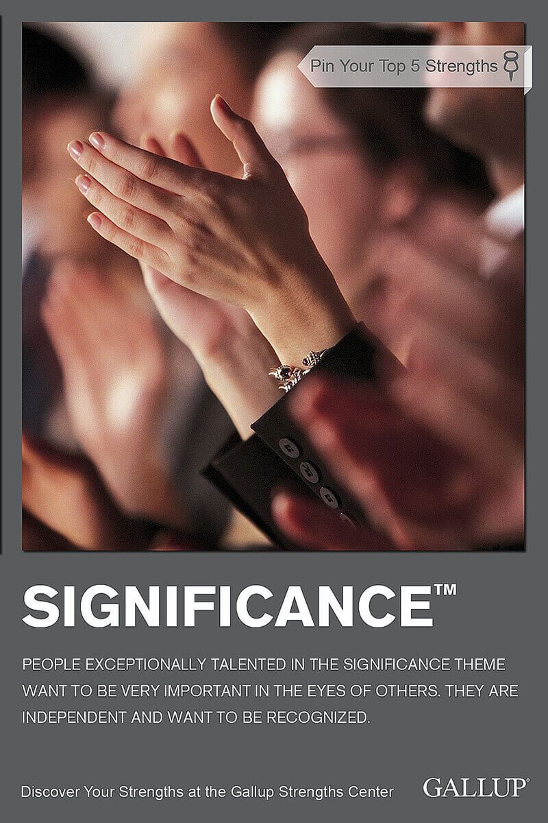존재감(Significance) 테마는 중요한 존재가 되고 싶은 강한 욕구를 가진 강점이다. 그리고 실제로 어느 조직, 공동체에서나 중요한 역할을 감당한다. 자신이 하는 말과 일에서 중요하다는 인식과 인정을 받을 때 가슴이 뜨거워짐을 느낀다. 아무리 좋은 팀과 조직에 있더라도 나의 위치와 역할이 중요하지 않다면 큰 의미가 없다. 오히려 내가 있기에 정의되는 조직과 팀일수록 나의 높은 가치로 인한 에너지가 넘쳐난다. 때문에 존재감 테마의 영향력은 사람들의 존경과 경외심이다. 다른 이들은 범접할 수 없는 위치에서 사람들에게 충분한 롤모델이 되는 강점이 바로 존재감 테마이다.