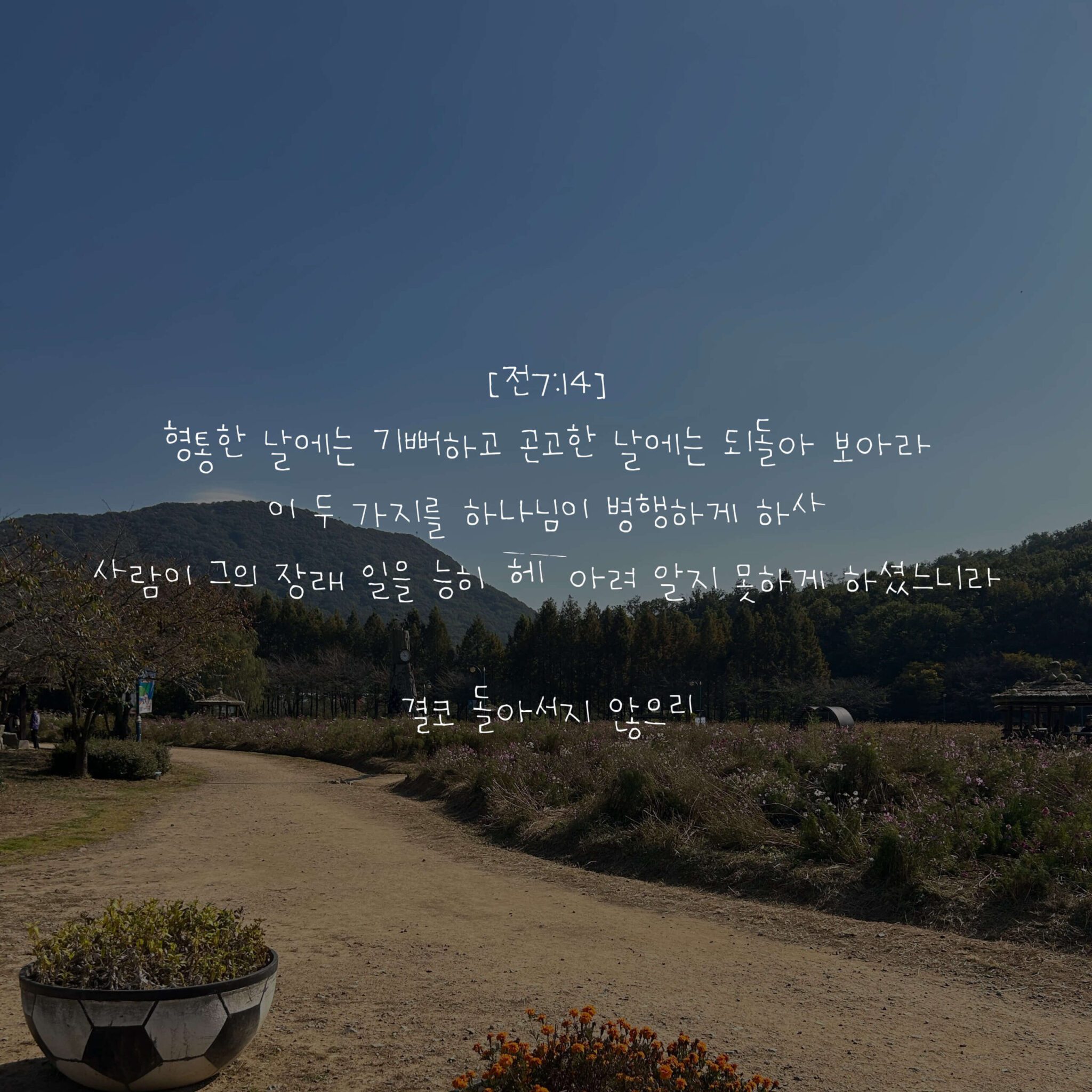 모든 날이 형통할 수 없다. 고난과 역경도 있고 나의 연약함으로 인한 후회도 있다. 그럴 때에는 생각해야 한다. 나의 행위와 마음과 동기가 어떠했는지 살펴야 한다. 하나님이 내게 주시는 기회와 선물일 수 있다. 나의 앞길을 내가 정하는 것 같으나, 모든 것이 주님의 손 안에 있다. 내가 믿는 것은 하나님은 나를 언제나 선한 길로 인도하신다는 것이다. 주님은 한…