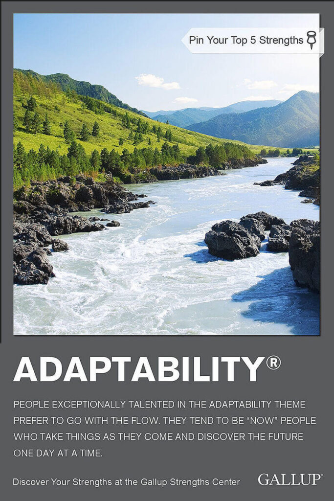 적응(Adaptability) 테마는 매순간을 즐기는 강점이다. 인생은 계획대로 진행되지 않는다고 믿는다. 때문에 어떤 상황에서도 본능적으로 반응하고 대응하는 능력을 지니고 있다. 보통 사람들은 계획대로 진행되지 않을 때 오는 긴장감과 스트레스가 있지만, 적응 테마의 주인공들은 오히려 이를 즐기며 더 놀라운 결과를 가져온다. 특별히 감각적이고 본능적인 판단과 행동으로 위기의 순간을 매우 쉽게 해결한다. 오히려 아무런 일도 일어나지 않을 때 이들은 무료함을 느낀다. 책상에 앉아서 반복적인 일을 하는 것보다 현장에서 순간순간을 느끼고 움직이는 업무나 역할이 더 잘 어울린다.