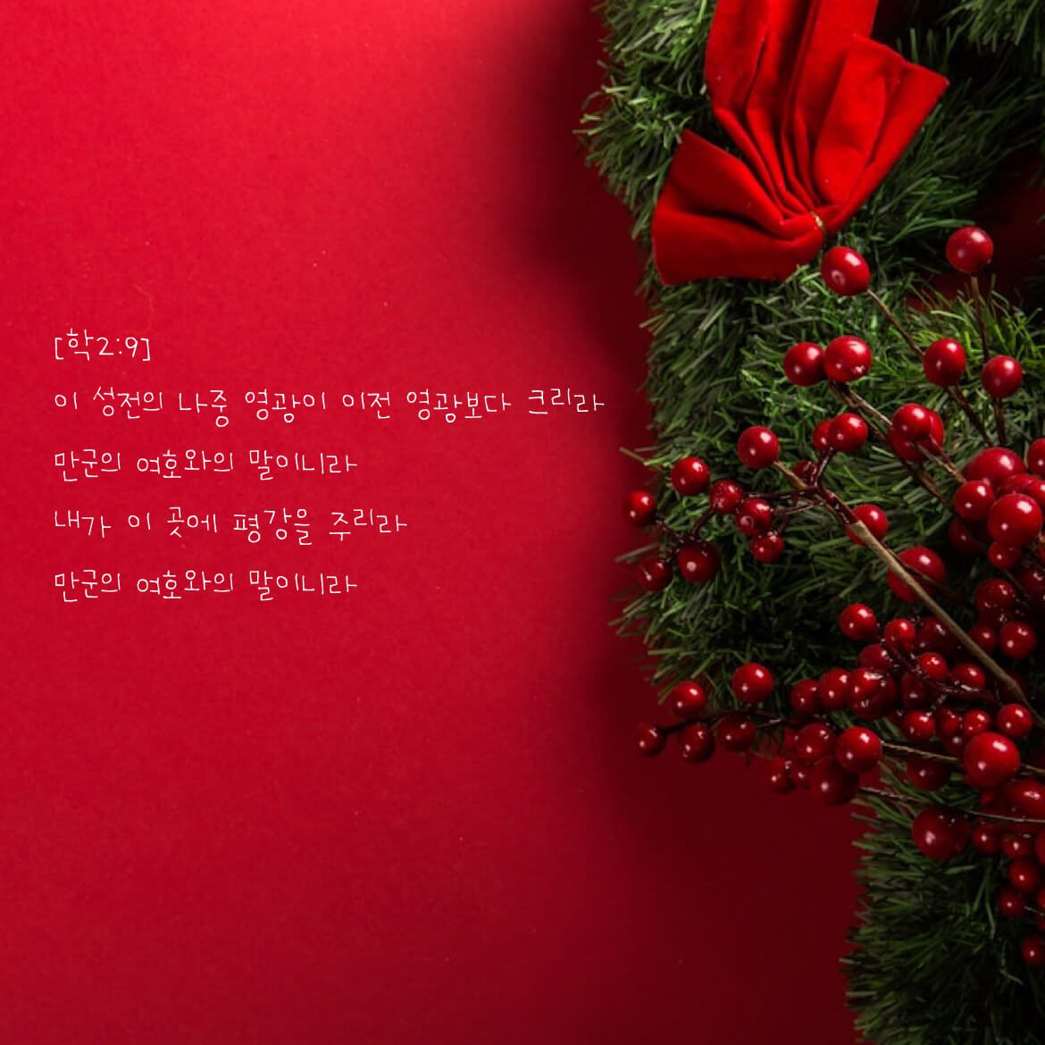 영광의 주님이 오시면 평강이 임한다. 평강은 하나님 나라의 상태이다. 겨자씨와 같고 옥토밭에 뿌려진 씨앗과 같다. 하나님의 나라는 반드시 나의 삶에 풍성한 결실을 맺는다. 노력에 의한 것이 아닌, 자라게 하시고 열매 맺게 하시는 하나님의 능력이다. 나의 수고와 노력까지도 주님은 평강으로 이끄신다. 내 삶에 오신 예수님! 제게 와주셔서 감사합니다! 할렐루야~ [학2:9] 이 성전의 나중 영광이 이전 영광보다…
