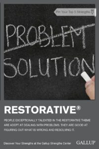 복구(Restorative) 테마는 영웅(해결사)의 강점이다. 무너진 것을 다시 세우고, 잃어버린 것을 되찾으며, 깨어진 것을 고친다. 이들은 다른 사람들이 포기한 자리에서조차, 희망의 눈으로 문제에 접근한다. 오히려 문제를 발견했을 때 더 열정적이며 문제의 근원과 해결점을 찾았을 때 희열을 느낀다. 사람들은 당장 눈에 보이는 문제에 집중하겠지만, 복구 테마의 주인공들은 탐정이 되어 실마리를 찾고 문제의 근원을 찾아낸다. 그리고 어떤 문제일지라도 담대하게 뛰어들어 문제를 해결하기까지 멈추지 않는 용감한 강점이다.
