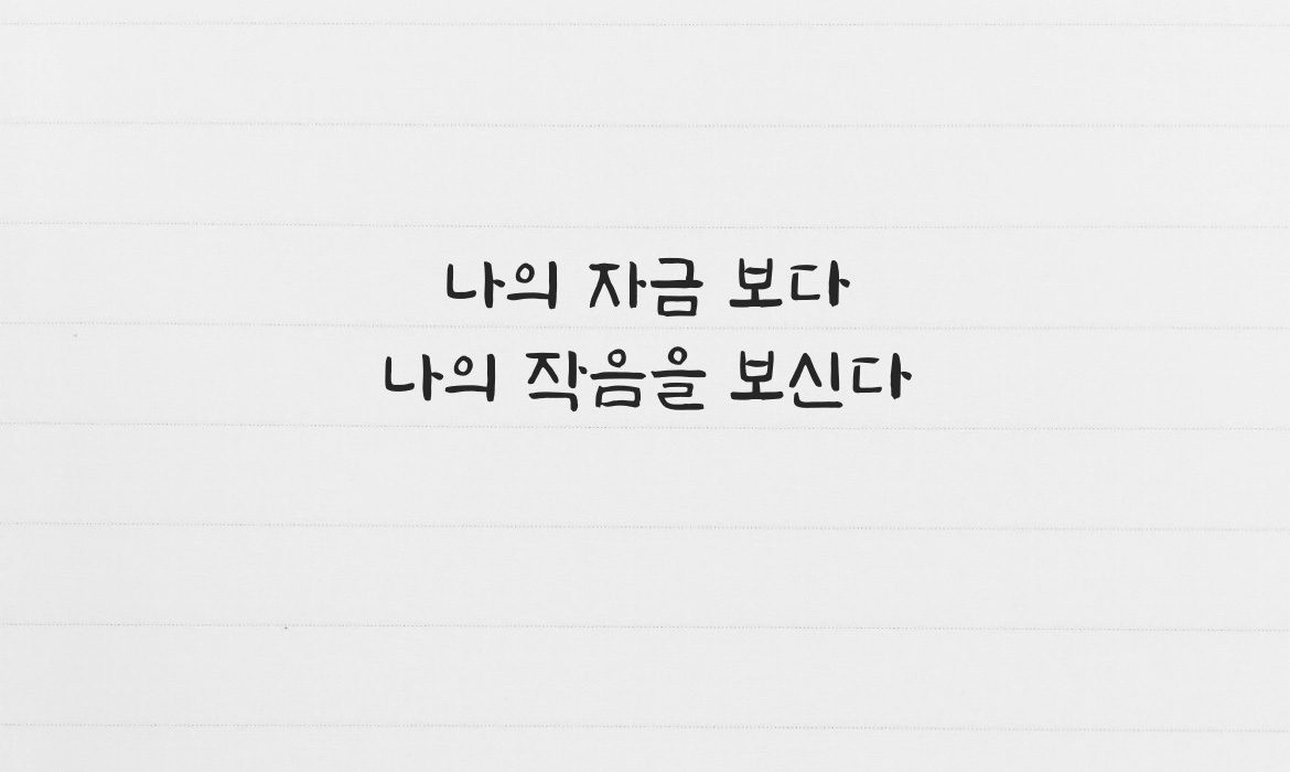 나의 자금 보다 나의 작음을 보신다 하나님은 나의 간절함과 겸손함을 보십니다. 누가복음 21장 3~4절 예수께서 이르시되 내가 참으로 너희에게 말하노니 이 가난한 과부가 다른 모든 사람보다 많이 넣었도다 그들은 다 그 풍족한 중에서 헌금을 넣었거니와 이 과부는 그 가난한 중에서 자기가 가진 생활비 전부를 넣었느니라