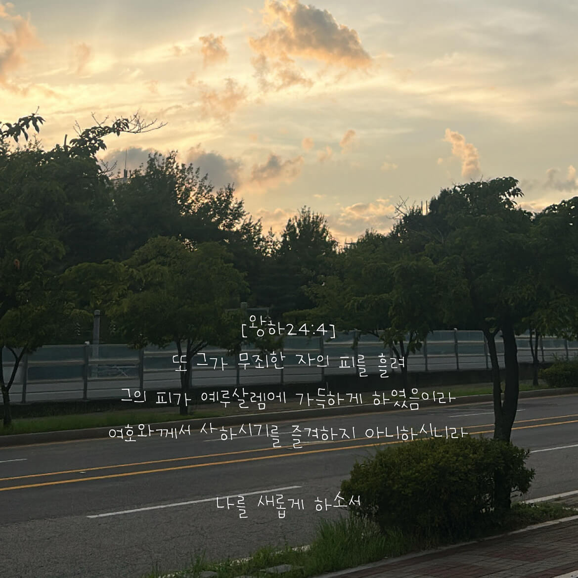 긍휼과 사랑의 하나님인 동시에 정의와 공의의 하나님이시다. 연약한 자의 신원을 살피시며 그들의 탄식에 귀를 기울이신다. 아무리 놀라운 선행과 사역을 하더라도 하나님의 율법과 규례를 떠난 자의 악행을 심판하신다. 므낫세의 죄악이 온 이스라엘과 하나님 앞에 진동하였다. 악한 영향력으로 이스라엘은 심판을 앞두었다. 무섭고 두렵다. 내 안에 있는 죄악과 교만함이 무죄한 자들과 연약한 자들에게 미칠까 두렵다. 주님 저를 가르치시고…