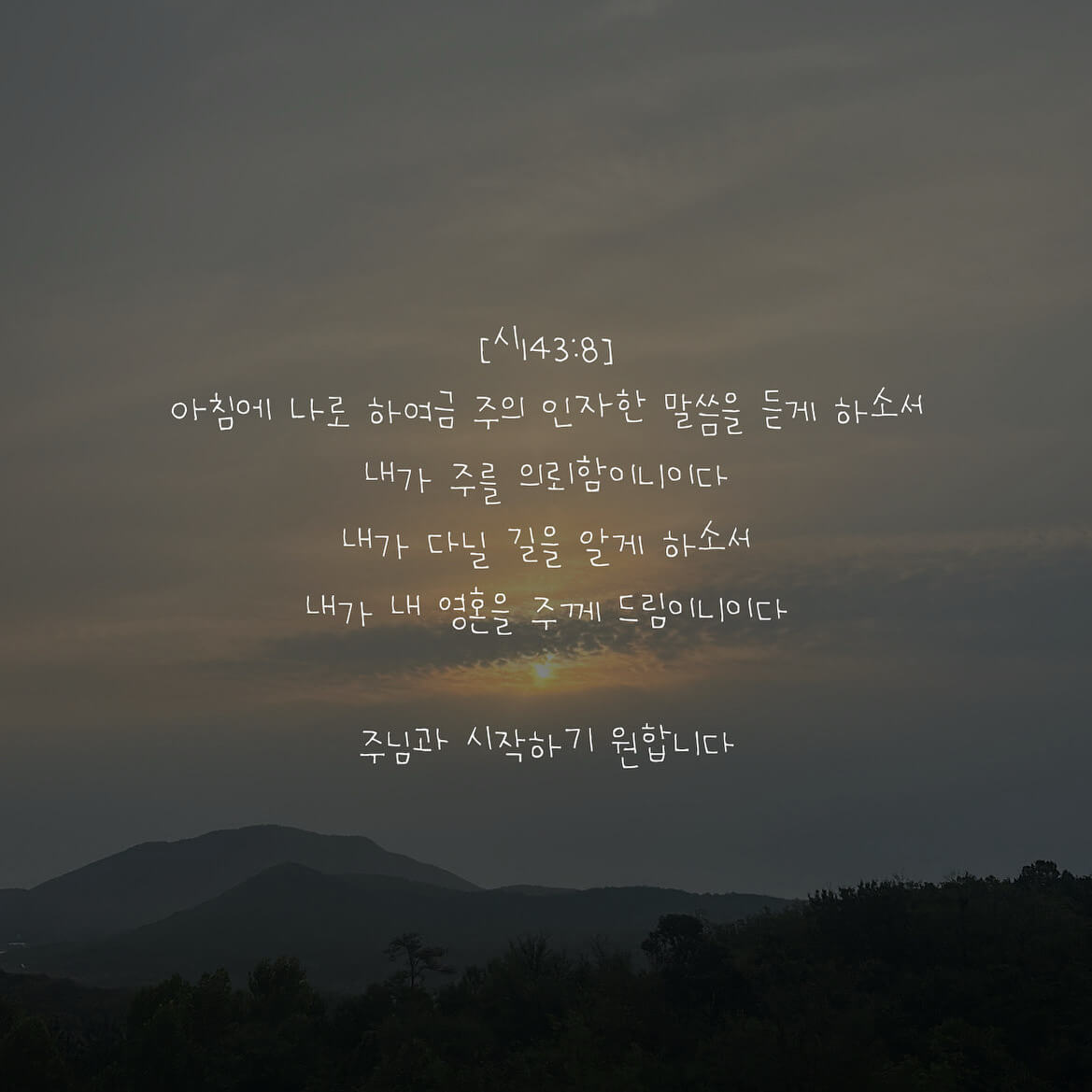 아침에 주의 말씀을 읽는다. 그리고 주의 음성을 기다린다. 오늘의 일과를 주께 맡기며 나와 동행하시기를 간구한다. 나는 연약하오니 나를 도우시고 인도해 주시기를 간절히 바란다. 내 삶이 주님의 말씀과 성품에 안에 있는지 다시 점검한다. 주님, 나를 살펴보시고 주의 곁에 있게 하소서. [시143:8] 아침에 나로 하여금 주의 인자한 말씀을 듣게 하소서 내가 주를 의뢰함이니이다 내가 다닐 길을 알게…